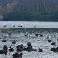 Severe overnight frosts and some chilly days left the lakes largely covered by ice. It was too thick for the birds to penetrate, but too thin to skate on. However, an oasis of open water remained for the birds.