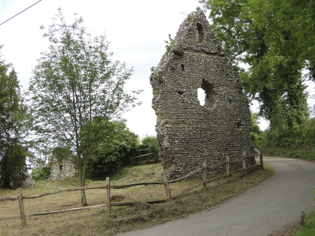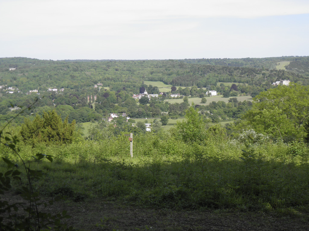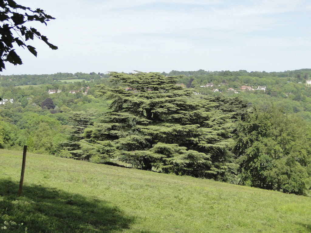 The Stepping Stones pub in Westhumble provided the lunch needed as fuel for the walk around the Surrey Hills. The food was perhaps slightly overpriced, but the quality was adequate and the service was acceptable. The walk passed close to the quaintly named Box Hill and Westhumble Station opened in 1867 and then alongside the rail track into fields bordering the River Mole. For geography enthusiasts there's a good example of a cut off meander, or dry oxbow lake alongside the . river. After a stroll through quiet lanes the walk turns uphill on a narrow path that eventually emerges on to woodland track. Ancient yew trees occasionally appear amongst the beeches, and after exiting the wood a large lebanon cedar can be seen, part of the Norbury Park arboretum. A further climb uphill was marred by a new high fence surrounding, and obscuring, the 1774 manor house. Nevertheless, a break from the climb was rewarded by the sight of several flowering orchids. There were some splendid views across the valley as the walk headed back towards Westhumble, and on the descent into the village the 13th century ruins of the flint-built chapel added history to this idyll so close to London.