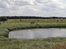 From the pub the route headed east towards Halfway Houses. On the right side of the road there were houses, but to the left there were grassy fields dotted with horses and cattle and offering views towards Sheerness. A left turn by the pub in Halfway Houses took the walk on to quite a busy road that passed a derelict dairy and then on past a holiday park towards the canal. This canal, known as the Queenborough Lines, was constructed in 1860 as a moat to deter possible sabotage to munitions depots in Sheerness. The stroll southwest on the raised bank of the canal is rewarded by views across the marshes of Sheppey and the distant hills of the Kent mainland. There were many friendly folk encountered on this part of the walk which ended in a housing estate with many tattooed limbs on show.