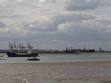 A footbridge over the railway provided the exit from estate and then a main road was negotiated to begin a very different section of the walk. For about 1km a public footpath wended it's way between old concrete sea defences and reclaimed land that had become an enormous car park for imported cars and vans. Eventually the path reached the coast, and the walk alongsise the estuary was the highlight of the trip. Oystercatchers and other wading birds fed as the tide receded and the Council had thoughtfully provided many seats to allow a leisurely enjoyment of the interesting waterways and mudflats.